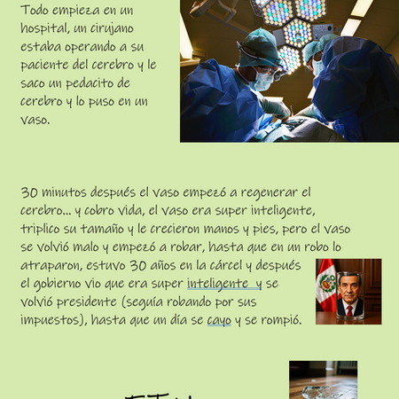 30 minutos después el vaso empezó a regenerar el cerebro… y cobro vida, el vaso era super inteligente, triplico su tamaño y le crecieron manos y pies, pero el vaso se volvió malo y empezó a robar, hasta que en un robo lo atraparon, estuvo 30